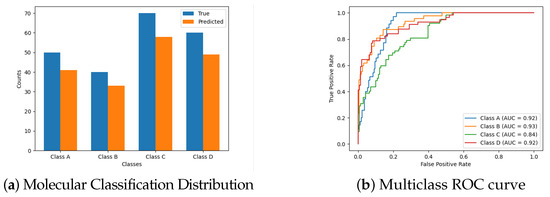 Multi-classification experiment results: (a) depicts the true and predicted values for the classification of chemical compounds, while (b) illustrates the ROC curves for each of the four classes (Class A, Class B, Class C, and Class D).