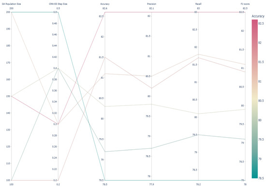 The GA population size on the left axis refers to the number of candidate solutions in the genetic algorithm. As the population size increases, the exploration of the search space is expected to improve. The CMA-ES step size is an essential parameter in the CMA-ES optimization process, controlling the rate of adaptation and convergence towards an optimal solution. The accuracy, precision, recall, and F1-score are standard performance metrics used to evaluate the classification performance of algorithms. The color of the lines is determined by the accuracy, with the Tealrose color scale indicating higher accuracy with a more vibrant shade. From the graph, it can be observed that the highest accuracy (84.6%) is achieved with a GA population size of 150 and a moderate CMA-ES step size of 0.3. This specific combination of parameters also results in high precision (84.1%), recall (85.2%), and F1-score (84.5%), indicating well-rounded performance of the algorithm. In addition, the graph shows that the performance decreases when the CMA-ES step size is either too small or too large, suggesting that there exists an optimal step size that balances the exploration and exploitation trade-off in the optimization process (Figure 9).