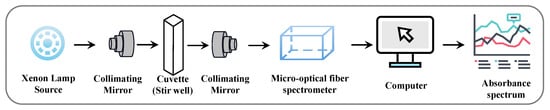 The experimental equipment required for building the data acquisition system using the absorption spectral data of tail coal suspensions included a quartz cuvette, a magnetic stirrer, a fiber-optic spectrometer, a UV quartz fiber optic, a dual-path cuvette holder, a pulsed xenon lamp light source, and so on. From Figure 2 and Figure 3, we can understand the data acquisition process. First, the xenon lamp light source instrument outputs light, which is then received by a collimating mirror and passes through a cuvette sample. Afterward, the light is output by another collimating mirror and received by a miniature fiber-optic spectrometer. The absorbance curve is displayed on the screen.