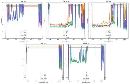 The experimental samples consisted of tail coal samples with ash contents of 25.6%, 34.4%, 38.0%, 44.0%, and 49.4%. The corresponding ash content labels for these samples were accurately determined using the fast ashing experiment commonly employed in the industry. Each tail coal sample was mixed with an equal amount of pure water to create a suspension, simulating the state of tail coal extraction in an industrial setting. Samples were obtained by taking a portion of the suspension from each sample. Since the samples were in suspension, settling phenomena occurred over time. To mitigate the impact on the experimental results, we ran a magnetic stirrer for 5 min at the beginning of each experiment to ensure thorough mixing. The cuvette holder used had a hollow structure, allowing us to collect absorbance spectra immediately at 0 s after stopping the magnetic stirring. Then, the samples were allowed to settle, and the absorbance spectra were collected at 0 s, 30 s, 60 s, 90 s, and 300 s. For each category, 31 samples were taken at each time point, resulting in five ash content categories. Therefore, a total of 775 data samples were obtained. The data type is a one-dimensional univariate sequence containing 2088 feature points. Figure 4 shows spectral data curves for 30 randomly selected samples from each category. Each curve represents a spectral data sample, illustrating the general trend of the spectral data for each category.