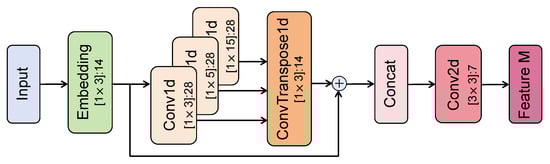 As shown in Figure 8 and Figure 9, we have used two types of figures to make the description of this module clearer. In the diagram, [1 × 3]:14 indicates a convolutional kernel size of 1 × 3 with 14 output channels, and so on. To address the differentiated features of spectral data at various wavelengths, this paper designed an MSCR module based on conventional convolutional neural networks. Traditional convolutional neural networks typically use fixed-size convolution kernels, which may result in a limited receptive field and difficulty in effectively capturing features of different scales and levels in the input data. Additionally, conventional convolution operations only extract information within a local receptive field, potentially making it difficult for the model to understand long-distance dependencies between pixels. By introducing convolution kernels of multiple scales, the model can better process features of different scales. Smaller kernels can capture finer details, while larger ones can capture broader contextual information. Conventional multi-scale convolutions usually just concatenate information of different scales, potentially overlooking the contextual relationships between scales and generating redundant information. To address these issues, residual connections and two-dimensional convolutional concatenation were introduced. Residual connections provide a direct shortcut bypassing intermediate layers, establishing long-distance information dependencies, allowing for faster information propagation and enabling the model to learn residual features and the differences between the input and output. Concatenating features of different scales and using two-dimensional convolution for feature extraction avoids redundancy, while reducing computational and memory overheads. The specific steps are as follows: