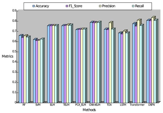 As shown in Table 4 and Figure 15, firstly, from an overall perspective, significant differences were observed in the performance of the various methods across the four evaluation metrics: accuracy, F1 score, precision, and recall. These metrics are key factors in measuring the performance of machine learning models and collectively determine a model’s overall effectiveness. Our approach demonstrated the best performance across all four metrics among these methods. RF and SVM performed relatively poorly, indicating their limited adaptability to the data. TELM and ELM exhibited a similar performance, with TELM showing slight improvements in precision and recall. PCA_ELM underperformed compared to ELM, suggesting that PCA did not significantly enhance ELM’s performance in this context. The LSTM model’s performance was average, particularly lacking in accuracy and F1-score. The TCN model showed good performance in terms of precision. Both the CNN + ELM and Transformer models performed well across all metrics.