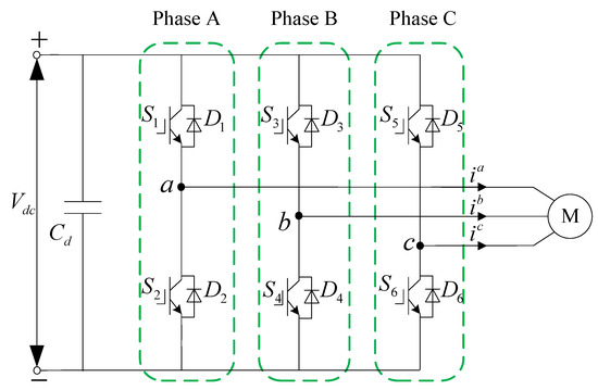 The topology of a two-level inverter is shown in Figure 1. The inverter is composed of six switching tubes () with anti-parallel diodes (). is the DC bus voltage [3]. , and are three-phase currents. Their positive directions are indicated in Figure 1.