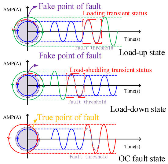 Since most current-based fault detection methods do not take into account transient currents during load changes, they exhibit poor resistance to interference. As shown in Figure 3, represents the current amplitude in the initial state, represents the current amplitude when transitioning to the second state, and represents the current amplitude after the fault occurs. During transient processes such as the loading/load-shedding state and the OC fault state, the instantaneous current value of the motor will change. It can be observed in Figure 3 that during the transient process of the loading/load-shedding state, the current vector will exceed the fault threshold. At this point, the above judgment method will mistakenly classify the loading/load-shedding state as an OC fault state.