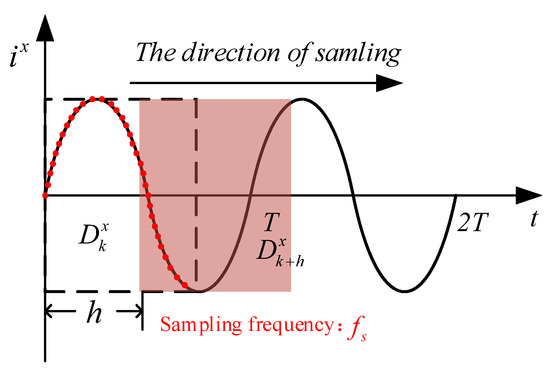 The input of the homogenization process is the current data sampled by the sliding window, and the output is the current data after modeling [9]. The length of the sliding window is N. The sliding step is h. k is the identifier of the set. The sampling frequency is . is the instantaneous current value of phase x (x represents and c) at sampling point n, and the data set of the sliding window is