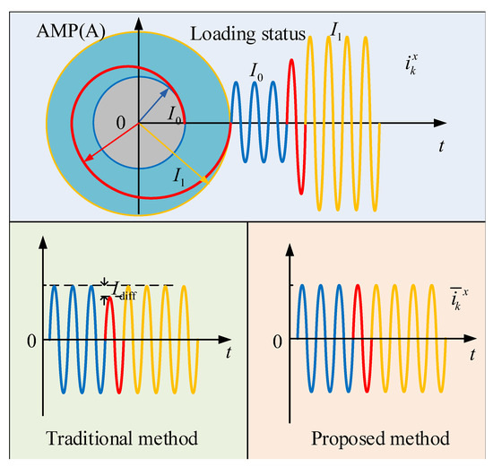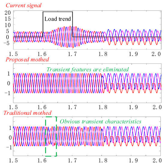 The varying modulus length of the homogenization method is illustrated in Figure 5, where and represent the amplitudes of a specific phase current before and after a state change. The traditional method uses the maximum value in the sampling period as the denominator and the current value as the numerator. When processing current data using the traditional method, the current waveform tends to decrease during the transient processes of load-up or load-shedding. However, the homogenization method proposed in this paper effectively eliminates the influence of the loading/load-shedding transient states, thereby separating them from the OC fault state.