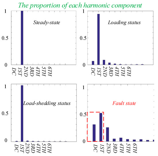 By using the FFT to process the data set mentioned above, the components of the current waveform at different frequencies can be extracted [10]. In the stable state, the current after FFT processing contains only the fundamental wave component, and the amplitude of the fundamental wave component is equal to the current amplitude. When the system is in the loading/load-shedding state, the waveform after homogenization differs from the waveform in the steady state. After FFT processing, the components of each frequency change, with little variation in the fundamental wave component. In the OC fault state, the current amplitude undergoes significant distortion, and after FFT processing, each frequency component will be markedly different from the scenarios mentioned above. This is primarily reflected in a significant increase in the amplitude of the direct current (DC) component and a significant decrease in the amplitude of the fundamental component. Other harmonics also show an increase. The FFT results of current data in various states are shown in Figure 7.