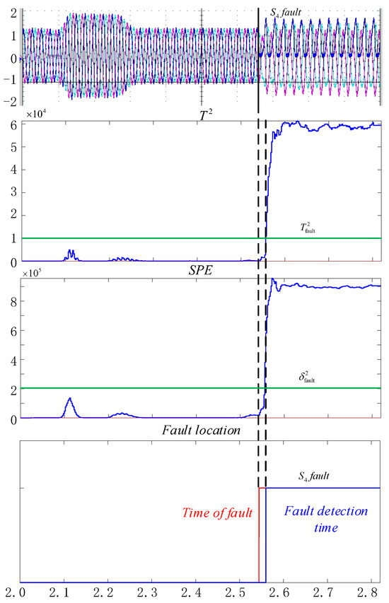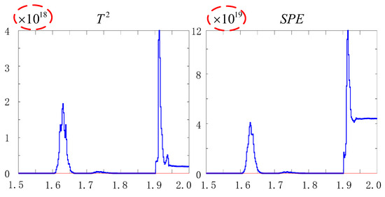 PCA is a multivariate statistical analysis method [19,20,21]. This article uses current data under the stable state as training data [13,15]. When PCA is used to detect the running status of the motor, the prediction error index of PCA is too high because the training matrix is not full rank. Figure 9 shows and of the motor by using the PCA method.