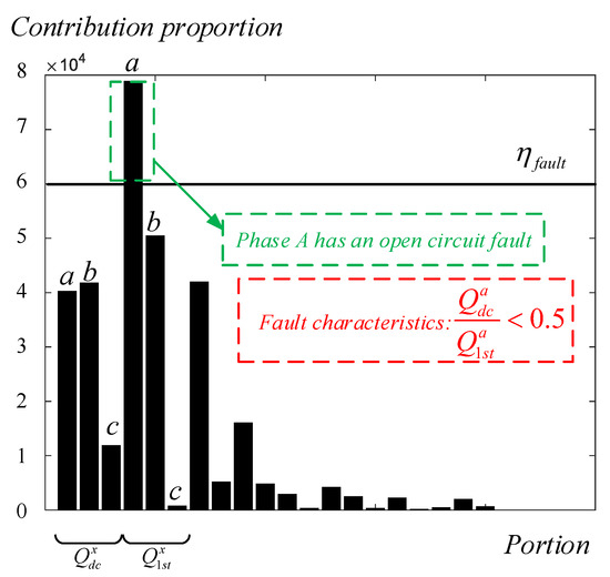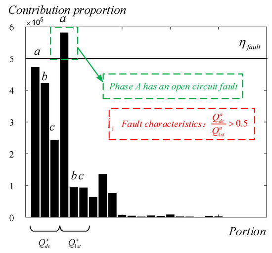 In the GPCA method, contribution proportions are used to locate fault components. Taking phase A as an example, Figure 12 and Figure 13 represent the contribution proportions of the three-phase current DC component and each harmonic when the switch tubes and have an OC fault. The first three terms in the figure represent the DC component contribution proportions of the three-phase currents , , and , respectively. The fourth to sixth terms are the fundamental wave component contribution proportions of the three-phase currents , , and . represents the fault threshold in the contribution proportion diagram. is used to compare the fundamental wave components of the currents in phases A, B, and C. When the fundamental wave component of a certain phase current exceeds the fault threshold, it can be considered that the switch tube controlling that phase current has an OC fault. As shown in Figure 12, when the fundamental wave contribution proportion of phase A exceeds the fault threshold , it indicates that phase A has an OC fault. When the ratio of the DC component contribution proportion of phase A to its fundamental wave contribution proportion is less than the constant 0.5, it indicates the switch tubes have an OC fault. Similarly, in Figure 13, when the ratio of the DC component contribution proportion of phase A to its fundamental wave contribution proportion is greater than the constant 0.5, it indicates the switch tubes have an OC fault.