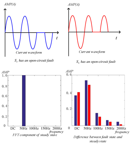 As shown in Figure 14, when the switch tube has an OC fault, the forward current in phase A will instantaneously disappear. Consequently, the DC component of phase A exhibits minimal changes during the FFT, while the fundamental wave component undergoes significant changes. Therefore, the ratio of to is small. When the switch tube experiences an OC fault, the negative current in phase A will instantaneously disappear, but the positive current in the next cycle will still exist. Hence, undergoes significant changes during the FFT, while the fundamental component undergoes minimal changes, resulting in a large ratio of to . Using 0.5 as the limit of the ratio helps determine which switch tube has an OC fault. As shown in Figure 12, the amplitude of the DC component is significantly higher when switch tube has an OC fault compared to when switch tube has an OC fault. The amplitude of the fundamental wave component is significantly lower when switch tube has an OC fault compared to when switch tube has an OC fault. However, regardless of whether or has an OC fault, the fundamental component of the phase A current undergoes the most significant change, and it will exceed the threshold when calculating the contribution proportion .