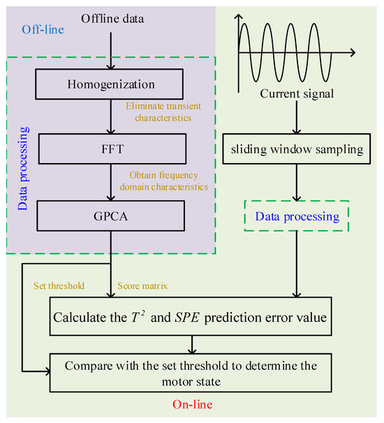 The overall process of health status detection is illustrated in Figure 15. The method in this paper is divided into two processes: the offline process (Off-line) and the online process (On-line). In the offline process, data are processed using the homogenization method and then data features are extracted using the FFT. The multi-dimensional features are fed into the GPCA algorithm model to calculate the control limit of and the control limit of . Simultaneously, parameters , , , and are set. In the online process, after data processing, only the values of and need to be calculated and compared with the pre-set , , , , , and from the previous offline process training. When the fault threshold is exceeded, the contribution proportion is calculated, and the fault value F is used to locate the fault.