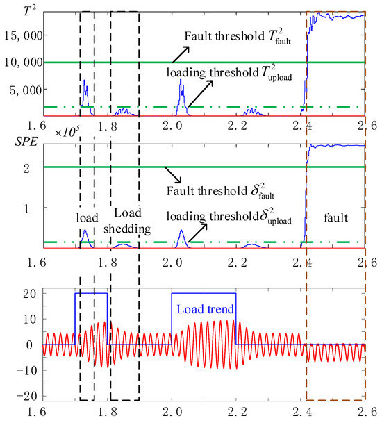 where is the element of the product of the current value of the test set and the training matrix. is the one-dimensionality reduction sorting of the front one-dimensional principal elements of the diagonal matrix, which can be regarded as a weight function. During the transient process of the loading state, the front l-dimensional element undergoes significant changes. Similarly, during the transient process of the load-shedding state, the front l-dimensional element also changes, but these changes are much smaller than the element values observed during the loading state. After the squaring calculation, the gap becomes more pronounced. At this point, a threshold should be set for the GPCA prediction error value to distinguish between the motor’s loading state and load-shedding state. This threshold is referred to as the loading threshold. The selection of the loading threshold must meet a condition; namely, it should be smaller than the minimum value of and that can detect the minimum loading current. In this paper, load states below times the rated current are considered as fluctuations. Therefore, the loading threshold can be set to the maximum value of and during the transient process when the load is 1.25 times the rated current.