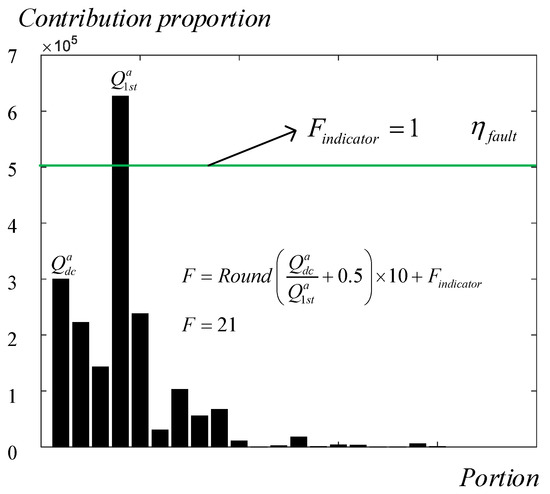 Figure 16 depicts the simulation results of health status detection for a motor drive system, including motor state detection and inverter fault diagnosis. By comparing the loading threshold and the fault threshold, the working state of the motor can be accurately determined, and simultaneously, the position of the faulty inverter switch tube can be located, as shown in Figure 17. The fault value F of the faulty switch tube is calculated based on the contribution proportion to determine the fault location. The methodology of this paper has been validated through simulations, demonstrating its capability to achieve health status detection for motor drive systems.