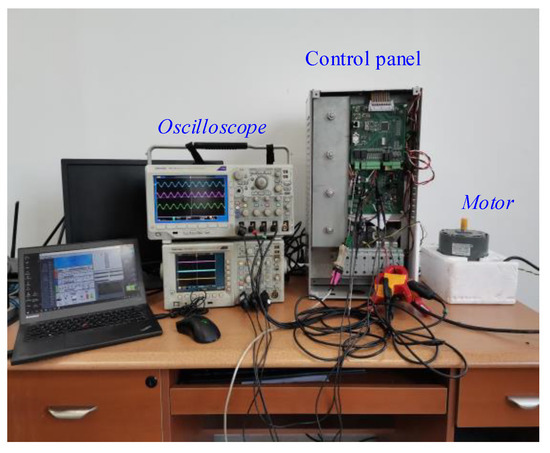 In an asynchronous motor empty-load experiment, we conducted tests involving a loading state and a load-shedding state to an empty load and simulating an OC fault. We modelled an OC fault by disconnecting the control signal of the switching tube. The empty-load current is and the OC fault occurs in the down tube corresponding to phase A, i.e., contains the OC fault. Figure 18 displays the experimental platform. The variation in load does not present an ideal step function, but this does not affect the experimental results.