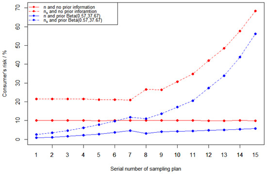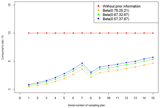 Here we take the different parameter cases with the prior information in Table 2. Without loss of generality, we first consider the first 4 cases in Table 2, and the risk figures of the 15 sampling plans with and without prior information are shown in Figure 1. When the actual quality levels of the lot are the consumer’s risk quality in Table 7, the corresponding consumer’s risk are shown in Figure 2. Consumer’s risk quality in ISO 2859-1:1999 is calculated under assumption that consumer’s risk is 10%, so the consumer’s risks are 10% without prior information in Figure 2.