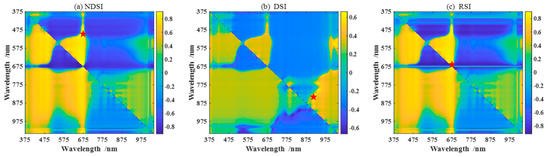 The crop spectral index is the feature obtained by combining spectral reflectance from sensitive wavelength regions, which is very useful for assessing and monitoring crop growth. Ratio spectral index (RSI), normalized difference spectral index (NDSI), and difference spectral index (DSI), which are most important for green crops [36], are used for our study. In addition, four other key spectral indices related to plant water content, namely plant senescence reflectance index (PSRI) [37], ripening stage of pod maturity index (RSMI) [38], structure-independent pigment index (SIPI) [39], and modified normalized difference red edge index (mNDRE) [37], are also employed. The calculation formulas are shown in Equations (1)–(7), where Rλ1, Rλ2, and Rλ3 represent the reflectance at wavelengths λ1, λ2, and λ3, respectively, which are labeled as “SpI-” prefix. Considering the differences in sensitive bands of spectral indices among different crops and varieties, we perform interactive combinations of bands in the range of 375–1041 nm. According to the correlation analysis with the pod’s water content, the wavelength bands with the highest correlation coefficient are obtained at the three periods, listed in Table 4, Table 5 and Table 6.