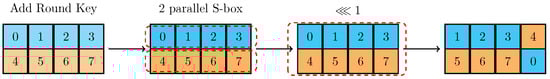 Each branch undergoes a transformation that involves the use of a function , which incorporates steps like AddRoundkey, S-box permutation, and a 1-bit left rotation, as shown in Figure 2. The S-box is as follows.