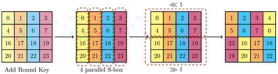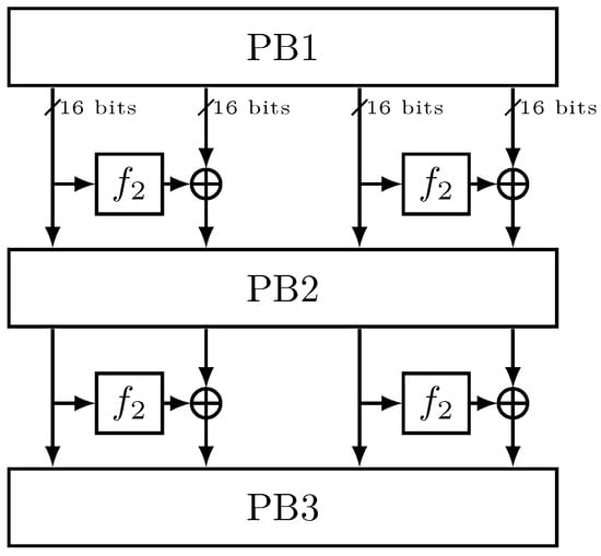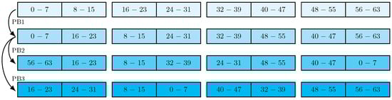 The function is applied to each branch, with its operation process adding to the cipher’s complexity and security, as shown in Figure 4. Different permutation functions (PB2 and PB3) are used for processing in odd and even rounds, individually. These operation processes of PB1, PB2, and PB3 are shown in Figure 5.