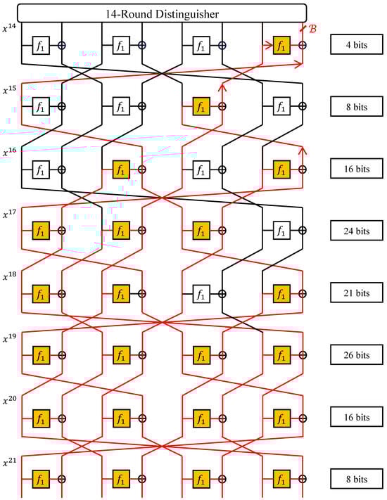 - Subkey Guessing. We initiate our analysis from the starting point of [28–30] and continue to trace forward to determine the positions where key guessing is required. The process of deduction is illustrated in Figure 6, where all the yellow-colored functions represent the computations required for reverse decryption. The subkeys used in these functions must either be guessed or deduced.Figure 6. Key recovery of 22-round System A.