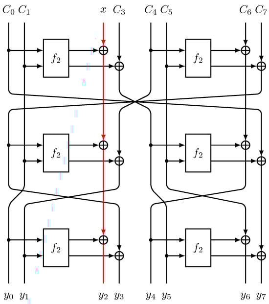 Notably, apart from x, all operations within this branch involve constants or operations between constants, thereby ensuring that the third branch exhaustively explores all possible scenarios. As for the other branches, they persistently engage in operations amongst constants, which implies that their outputs also remain CONSTANT. This phenomenon is depicted in Figure 7, where the red lines illustrate the diffusion pattern of the third branch. It is observed that even after two rounds involving PB2 and PB3 operations, the third branch does not diffuse into other branches. Consequently, as long as the eight bits of the third branch are ACTIVE at the input, a distinguisher can consistently be identified, regardless of the number of encryption rounds.