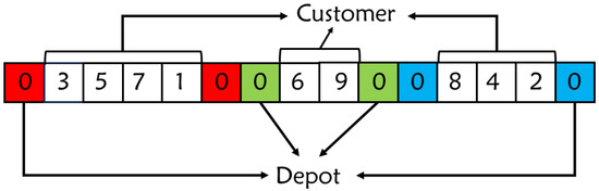 However, applying RSO to VRPTW requires a tailored encoding scheme and operators that align with its unique characteristics. The selection of encoding rules significantly impacts the algorithm’s performance. A well-designed encoding scheme can streamline operations, minimize computational complexity, enhance efficiency, and facilitate decoding. Conversely, suboptimal encoding may restrict the search space, compromise solution precision, and increase computational complexity. Encoding rules encompass various methodologies such as binary encoding, symbolic encoding, and floating-point encoding among others. It is crucial to abstract the mathematical model for the given problem while emphasizing primary contradictions over secondary ones. In the context of VRPTW, the encoding must capture both the sequence of customer nodes and the vehicle IDs. In this study, a real-number encoding approach is employed as Figure 1, with the distribution center designated as “0” and the demand points consecutively encoded as 1, 2, 3, …, whereas the vehicle IDs are represented by real numbers 0, 1, 2, …, thereby establishing the encoding rules for the routes.