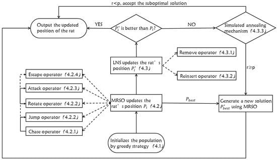 This paper presents a modified rat swarm optimization algorithm, named LNS-MRSO, which combines the strengths of both the traditional rat swarm algorithm and the large neighborhood search algorithm. Figure 2 illustrates the framework of LNS-MRSO. MRSO introduces five innovative operators: chase, jump, rotate, attack, and escape to update the positions of rats. These positions are further refined using a multi-factor-guided remove operator and a distance-increment-guided reinsert operator. In case a new position exhibits inferior quality, the algorithm incorporates a simulated annealing mechanism to evaluate its retention; if found unsuitable, it is replaced with an updated position from MRSO. Conversely, if the new position is superior, the current position is promptly updated.