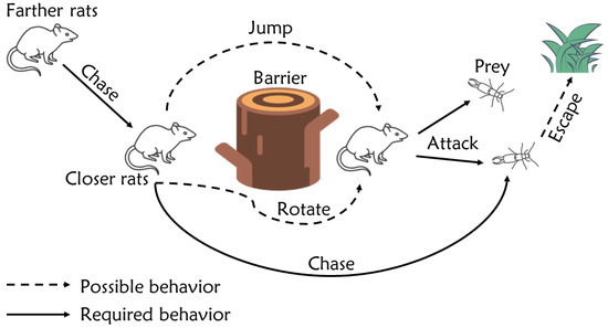 In our comprehensive investigation of cooperative prey chase behavior among rats, the presence of obstacles is a pivotal aspect. These obstacles may manifest as physical barriers or environmental hazards. Upon encountering such obstacles, rats leverage their acute environmental perception and exceptional motor abilities to promptly and precisely determine whether to leap over or circumvent them. This decision-making process is deliberate, grounded in a profound comprehension of environmental shifts and a meticulous evaluation of locomotor capabilities. In this study, we introduce to represent the likelihood of rats encountering obstacles during the chase, a likelihood that is shaped by variables such as obstacle density, rat locomotion velocity, and environmental intricacy. When confronted with obstacles, rats activate avoidance mechanisms, engaging in intricate calculations and strategic appraisals to select the most optimal avoidance strategy. These strategies are aimed at maximizing the prey chase success rate while minimizing the cost associated with obstacle avoidance.