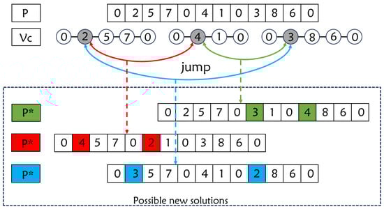 To accurately simulate the process, this study introduces two obstacle avoidance strategies: the jump operator and the rotate operator. The jump operator, drawing inspiration from mutation operations in genetic algorithms, enables rats to leap over obstacles. However, in VRPTW, direct jumping can render solutions infeasible due to time window constraints. Therefore, we specifically designed the jump operator to maintain path rationality and enhance solution diversity by randomly swapping the positions of customers with strict time window requirements. If we take Figure 4 as an example, customers 2, 4, and 3 are the initial customers on their respective routes, and their left time windows are narrower than those of other customers, facilitating the satisfaction of time window constraints through pairwise swaps. Figure 4 illustrates that swapping customer 4 with customer 3 results in a green code, swapping customer 2 with customer 4 leads to a red code, and swapping customer 2 with customer 3 produces a blue code. These three codes represent potential outcomes achieved through the jump operator. The functionality of the jump operator is illustrated in Figure 5.