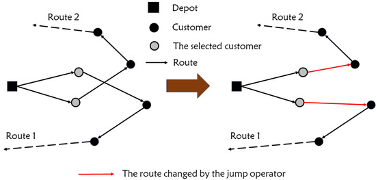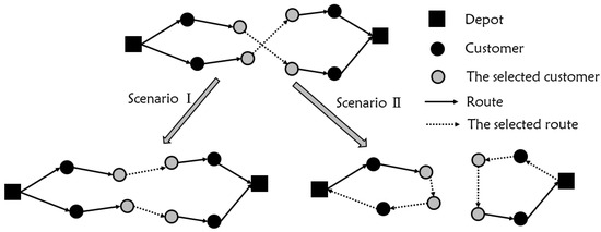 Herein, signifies the objective function value, encompassing the fitness measure, signifies the cumulative distance traversed by the vehicles, represents the aggregate of capacity constraint violations across various routes, and represents the aggregate of time window constraint violations pertaining to all customers. Given the relative difficulty of violating capacity constraints, is assigned a value of 1; conversely, as violating time window constraints is less challenging, is assigned a value of 100. In the proposed algorithm, T denotes the temperature parameter, which decreases progressively as iterations ensue, thereby rendering the acceptance criteria increasingly rigorous. After each iteration, the value of T is revised via , where represents the cooling rate, adhering to the condition . Whenever a novel optimal solution is uncovered, T is reinstated to its initial value, . Herein, is established to accommodate a neighborhood solution that is inferior to the current solution by with a likelihood. To guarantee a gradual annealing process, the initial temperature is determined utilizing the approach advocated by Ropke [33].