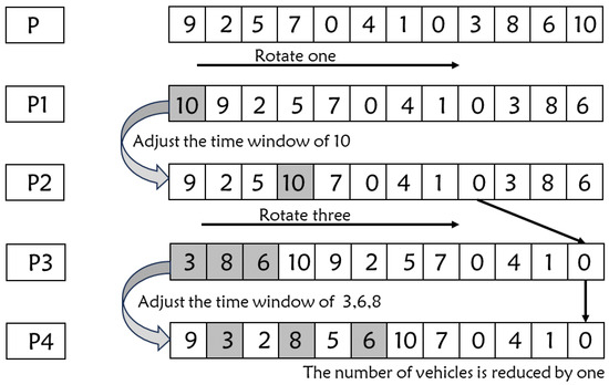 The rotate operator, a sophisticated obstacle avoidance technique, incorporates rotation and time window adjustment steps. It achieves obstacle circumvention by reassigning customers among vehicles, while ensuring that post-transfer routes adhere to time window requirements. The challenge lies in identifying the optimal customer transfer scheme that satisfies time window constraints without escalating vehicle usage, crucial for minimizing the number of vehicles utilized. Figure 6 illustrates a unit rotation from P to , where customer 10 is inserted into the route [9,2,5,7] to form [10,9,2,5,7]. However, this new route may violate time window constraints, necessitating adjustments. Transitioning from to involves repositioning customer 10 between customers 5 and 7 to meet the condition . Sequential adjustments can be made when rotating multiple units.