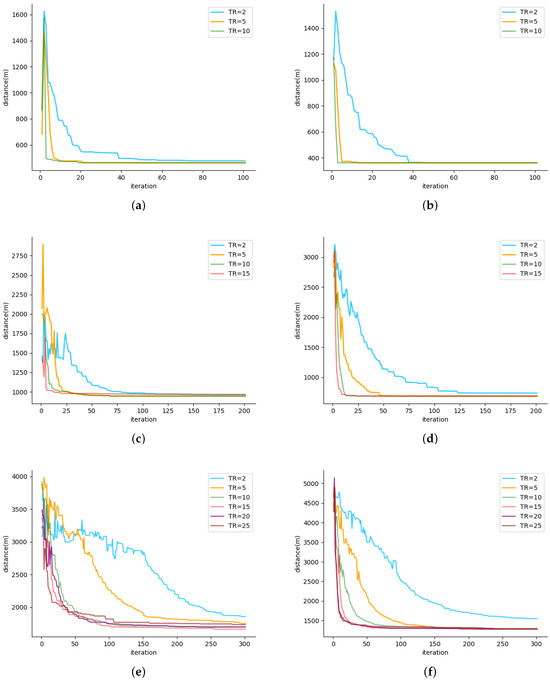 During the algorithm’s iterative process, if the total cost of the new solution is inferior to that of the current optimal solution, the optimal solution is updated with the new solution’s path set. If the cost of the new solution surpasses the global optimal but remains below the current feasible solution, the current feasible solution is replaced with the new solution. For instances where the new solution’s cost exceeds the current feasible solution, adhering to the simulated annealing paradigm, the new solution retains a likelihood of being accepted as the current feasible solution. This likelihood is modulated by adjusting the temperature parameter T. Specifically, when , the probability p is computed as follows [32]: