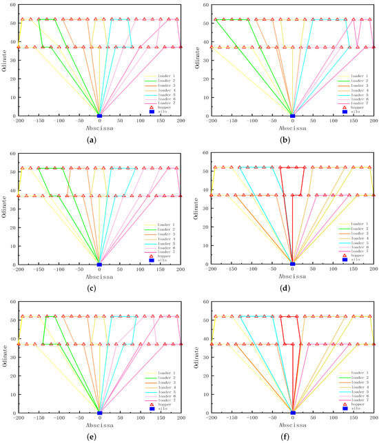 Comparison of feeding routes. (a) LNS-MRSO-feeding route of sand. (b) ACO-feeding route of sand. (c) LNS-MRSO-feeding route of crushed stone A. (d) ACO-feeding route of crushed stone A. (e) LNS-MRSO-feeding route of crushed stone B. (f) ACO-feeding route of crushed stone B.