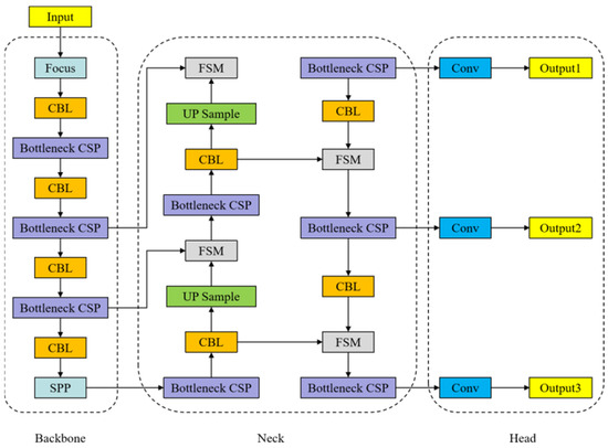 The neck layer of the YOLO v5 algorithm mainly uses the Feature Pyramid Network (FPN) and Path Aggregation Network (PAN) structures. In 2017, Tsung-Yi Lin et al. pioneered the introduction of FPN [12]. FPN combines multi-scale features through a top-down hierarchical structure. The top-level features are up-sampled and fused with the bottom-level features. In this way, FPN obtains high-resolution and strong semantic features. However, FPN only passes the semantics from the top layer to the bottom layer. It does not pass the location information of the bottom layer feature map to the top layer. Therefore, the information of the top layer predictive feature map is not perfect. PAN adds a bottom-up, hierarchical structure and cross-layer connectivity with the same horizontal layer on the basis of FPN. It can pass the bottom layer’s feature information to the top layer’s predictive feature map effectively. Although this structure has many advantages, this method ignores a lot of redundant and conflicting information generated via direct the fusion of features of different scales. It limits the ability of original multi-scale representation. Therefore, we improved the neck layer with the FSM module [13] instead of the Concat module in this paper. The purpose was to filter conflict information. And this approach can prevent the special-case features from being overwhelmed due to conflicting information. The structure of the improved algorithm is shown in Figure 1.
