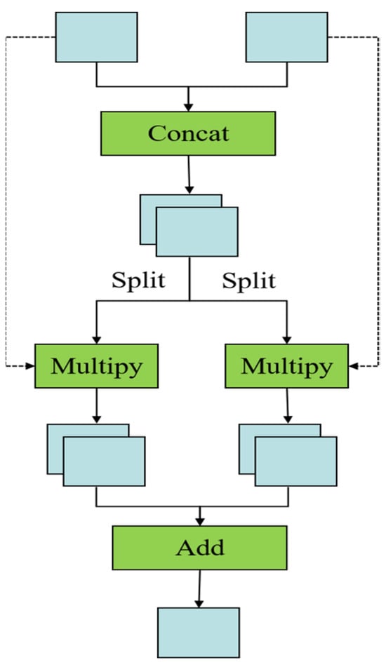 As can be seen from Figure 1, the input images first enter the focus module for slicing. The regions of each slice are staggered at a certain interval to obtain the features after slicing. The feature output after slicing and combining is sent to the CBL module for convolution output; then, it enters the Bottleneck CSP module. The module structure divides the input into two parts. Part of it carries out the feature extraction of the Bottleneck branch. The other part transits through a convolution layer, and finally, it stacks in depth. The main purpose of the CSP structure is to enrich the realization of a feature learning network and reduce the memory occupation by nearly half. Similarly, the output from the first CSP module enters the CBL and CSP modules twice, and the output is bridged to a cascade structure deeper in the network at this moment. Then, it will enter the CBL and SPP modules. Because the input size becomes smaller after convolution at this moment, in particular, the extraction of small target features has gradually become difficult. Therefore, the SPP module was added to increase the maximum pooling operation of slices, and the multiple channels’ characteristics were significantly enhanced. The updated module realizes the high integration of global features and local features, and it enriches the expressive ability of feature maps. The following part is mainly intended to splice the features of the previous convolution operations. Because the input data dimension is different from the output data dimension, the dimension of the output becomes smaller. Starting from the first CSP module, the dimensions are cascaded through convolution, up-sampling, and other operations. The three outputs shown were obtained respectively. Three outputs were convolved as the input of network structure prediction. Three output detection results were obtained respectively. In order to filter the conflict information achieved via different levels of feature map fusion, a feature specify module (FSM) is proposed to replace the original Concat module. The general structure of the FSM is shown in Figure 2.