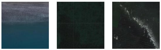 In most cases, the approach involves near-shore ships’ target detection when a ship is moored at a pier. That process can be affected due to the adjacent pier and near-shore buildings. The automatic target detection can be disrupted [21,22]. Therefore, the target interception of major ports covered 98% of ships when the data set was built up. The data came from open, high-definition remote sensing images and manually intercepted ship remote sensing images with different weather, different coordinates, different directions, and different scales. In addition, there were related pictures collected from the internet, which constitute a data set of 1952 images. The obtained data set was divided into a training set (for learning), a validation set (for setting hyperparameters), and a test set (for testing prediction effects) with a ratio of 7:2:1. The total number of pictures is 1952, and the total number of ships is 4652, resulting in an average of 2.4 ship targets per picture [23]. Some samples are shown in Figure 5. In addition, in order to reduce the marine background interference in ship detection, background pictures were also intercepted as negative samples, which can not only improve the detection accuracy but also reduce the false alarm rate. Some background pictures are shown in Figure 6.