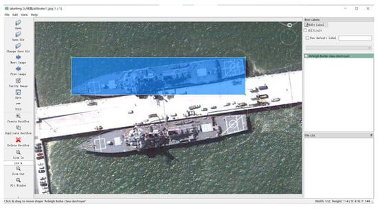 The Anaconda prompt command line was used, and labelImg was adopted for data labeling, which is shown in Figure 7. The horizontal labeling box was used to label ship targets. When labeling was conducted, the prediction box contracting the non-target part was avoided as much as possible, which can circumvent the background interference of network training [24]. For example, when labeling ships moored in port is conducted, the prediction box should avoid the dock part to more clearly distinguish between the background and the target.