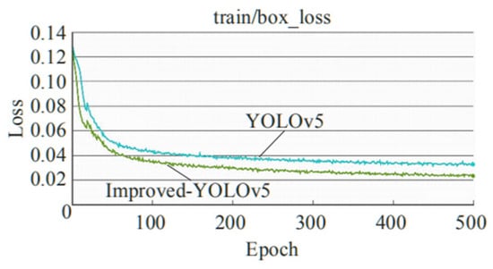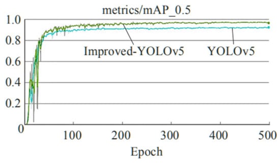 The VOC weight file was adopted for the pre-training weight. There are four pictures per training cycle, each with a 416 × 416 image processing size. Each time an epoch was trained, a weight file was automatically generated for the system. It can record the update of weight parameters after the current round of training has been completed [25]. The loss curve is shown in Figure 8. The horizontal coordinate is the number of epoch training times. The vertical coordinate is the loss value of the predicted edges. The loss value gradually decreased with the training process. The recognition ability of the network model also improved, which indicated that the network converged towards the real situation. The boundary loss value curve of the improved YOLO v5 demonstrated better convergence properties during its descent. Figure 9 shows the curve of the Mean Average Precision (mAP) index when the threshold of Iou was 0.5. The mAP value of the improved YOLO v5 is significantly better than that of the original algorithm.