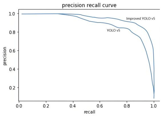 The precision and recall (P-R curves) of YOLO v5 and improved YOLO v5 are shown in Figure 12. By analyzing and comparing the precision and recall (P-R curves) of the models, it can be found that the vertical coordinate precision represents its correct rate of segmenting out for vehicle targets. The horizontal coordinate recall represents the ability of the network model to segment out all the vehicle targets in the image. Ideally, the P-R curve is a straight line with a precision of 1 at all times. A well-performing model can keep the precision at a high value while the recall is growing. A poorly performing model needs to sacrifice a lot of precision value in exchange for an increase in recall. The P-R curve of the improved YOLO v5 model was above that of the YOLO v5 model. The recall was higher for the same checking precision. The detection ability for ship targets is obviously promoted through the improved YOLO v5 model.