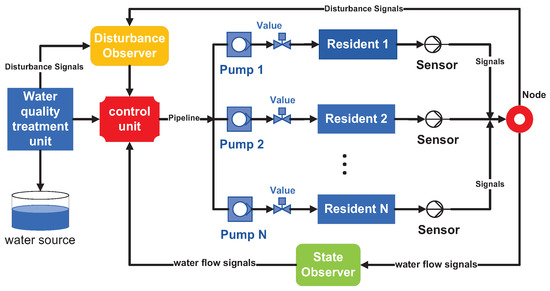 With the increase in urbanization levels, urban populations have been steadily saturating. This leads to a growing demand for water. As a result, urban water supply systems (UWSSs) face significant pressure. In [39], some findings on UWSSs were summarized. Improving the supply ability of UWSSs can reduce resource waste and energy consumption and ensure the stability of water supply pressure [40,41,42]. Figure 1 shows the relationship between observers, water flow, and residents in a UWSS. Considering the non-negativity of water flow and the switching characteristics exhibited by the changing resident water data, the UWSSs can be abstracted into SPSs. In practice, it is not easy to measure the water consumption of residents. Meanwhile, water supply systems are inevitably affected by disturbances such as damaged pipelines, weather, and so on. Therefore, it is necessary to establish both state and disturbance observers for UWSSs. Finally, it is reasonable to employ a bumpless controller to minimize the effects of water flow bump during controller switching. Considering the points mentioned above, a UWSS model is described as follows: