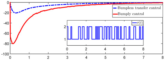 Figure 4 and Figure 5 show the simulations of the errors and under ADT switching, respectively. Figure 6 and Figure 7 present the simulations of the control signals under the bumpless transfer control and bumpy transfer control. It can be found from Figure 6 and Figure 7 that the bumpless transfer controllers have smaller fluctuations than the bumpy transfer controllers. Additionally, a comparison between Examples 1 and 2 shows that without the bumpless transfer controller, the error system has more bumps when the system is switching.