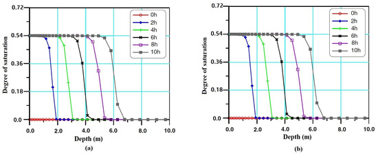 Figure 1. (a) The curves of the RDITGCNFE solutions of infiltration moisture content at h, 4 h, ⋯, 10 h, respectively. (b) The curves of the TGCNFE solutions of infiltration moisture content at h, 4 h, ⋯, 10 h, respectively.