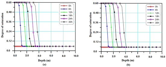 (a) The curves of the RDITGCNFE solutions of infiltration moisture content at h, 12 h, ⋯, 30 h, respectively. (b) The curves of the TGCNFE solutions of infiltration moisture content at h, 12 h, ⋯, 30 h, respectively.