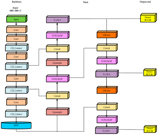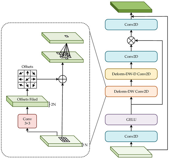 D-LKA mainly consists of the following three major components. First, large convolution kernels are used to capture extensive contextual information in images, simulating the large receptive field of the self-attention mechanism. Second, deformable convolution technology is combined to enable the model’s sampling grid to flexibly adjust based on image features, adapting to diverse data patterns. Finally, the 2D and 3D versions of D-LKA demonstrate excellent performance at different data depths. Additionally, D-LKA flexibly adjusts the sampling grid through deformable convolution, allowing the model to better adapt to different data patterns. This can effectively solve the difficulty of detecting small and multiple targets in complex backgrounds or under different lighting conditions. The architecture diagram of D-LKA is shown in Figure 9.