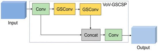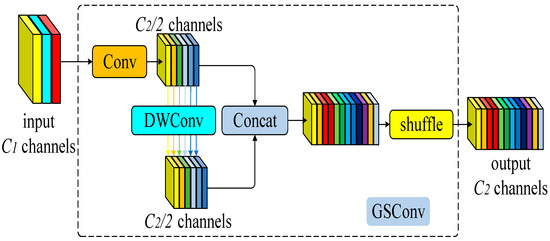 Compared with standard convolution, GSConv reduces its computational cost by approximately 30% to 40% while maintaining competitive performance. To enhance the model’s performance further, we replaced the standard convolution in the neck layer with GSConv and introduced a vision over vision-group-wise spatial convolution and shuffle pooling (VoV-GSCSP) module based on GSConv. This module can further improve the network’s lightweight and efficiency while ensuring accuracy. The calculation process of the SC and DSC is illustrated in Figure 6, and the calculation formulas are presented in Equations (11) and (12). The detailed structure of the GSConv and VoV-GSCSP modules is elaborated in Figure 7 and Figure 8.