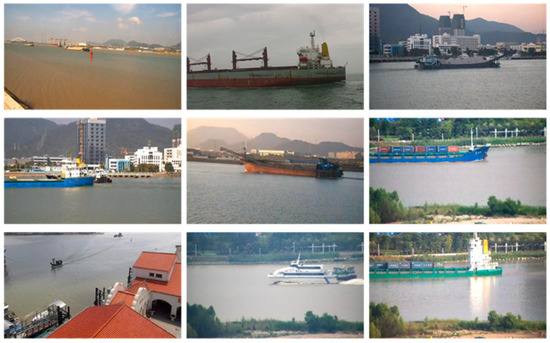 The experimental dataset in this paper was comprised of two parts: one was a self-made dataset containing 1194 ship images, and the other was the publicly available SeaShips dataset [26], which contains 7000 ship images, as shown in Figure 10. To enhance data diversity and experimental accuracy, this paper combined these two datasets to form a mixed dataset. This mixed dataset covered nine common types of ships and island targets at sea including container ships, ore carriers, passenger ships, bulk carriers, fishing boats, cruise ships, general cargo ships, islands, and other ships.