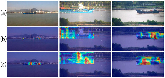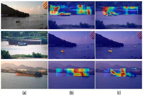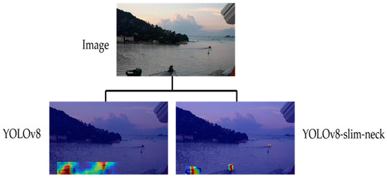 As shown in the heatmaps in Figure 13, the model adopting the deformable-LKA attention mechanism was highly focused on the detected objects. However, the original model tended to focus more on features in the background and peripheral areas. The results indicate that the adopted deformable-LKA attention mechanism can effectively improve the accuracy of detecting different ship targets and can adapt well to changes in complex environments.