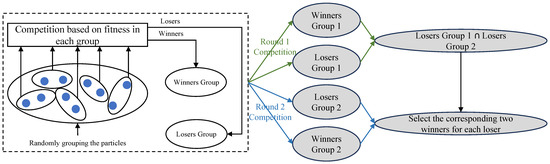 First, the proposed exemplar and updated particle selection method (referred to as the dual-competition-based strategy, DCS) can be illustrated in Figure 1. To be specific, the competition mechanism [12] is independently executed for twice at each generation, leading to two winners groups and two losers groups. Afterwards, the particles to be updated at each generation can be obtained by taking the intersection of the two loser groups, namely, “Losers Group 1” and “Losers Group 2” in Figure 1. Consequently, the exemplars for the obtained particles to be updated are the corresponding winners in “Winners Group 1” and “Winners Group 2”. Here, a brief of the competition mechanism is presented to ensure the integrity of the proposed mechanism: first, a swarm with size is randomly divided into sub-swarms and second, in each sub-swarm, the particle with the better fitness is regarded as the winner and put into the winners group while the other one is put into the losers group.