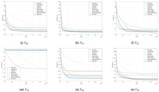 From Table 1, one can find that the proposed PSO-DC is generally competitive with respect to the average performance: it outperforms the peer algorithms on 10 benchmarks out of the 15 test cases. To provide deeper insight, PSO-DC wins two, four, two, and two times on the loosely coupled functions to , moderately coupled functions to , tightly coupled functions to , and fully coupled functions to , respectively. Consequently, it is reasonable that PSO-DC has advantages in solving complicated benchmarks. Furthermore, for the comparison results of the statistical test, PSO significantly outperforms DLLSO, APSO-DEE, TPLSO, RCI-PSO, DECC-DG2, DECC-MDG, and MLSHADE-SPA for a total of 11, 11, 13, 10, 13, 13 and 12 times, respectively, which also demonstrates the competitiveness of PSO-DC. In summary, from the numerical comparison results, PSO-DC is competitive in solving LSOPs, especially for complicated benchmarks. This indicates that PSO-DC has been improved in balancing exploration and exploitation, benefiting from the improved diversity preservation ability.