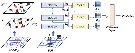 Recent advancements in deep learning have led to the development of numerous models for predicting crowd flow []. Given the advantages of CNNs in capturing image features, urban crowd flow prediction frequently employs CNNs [,,,] to capture the spatial correlations of crowd flows in surrounding areas. Zhang et al. introduced the DeepST model [], marking the first application of CNNs to urban crowd flow prediction. This method models urban crowd flow at each time interval as an image and samples data across different time scales (e.g., hourly, daily, weekly) to generate sequences at three temporal granularities. However, the predictive performance of this approach is limited by the number of convolutional layers—as the number of layers increases, the performance rapidly deteriorates. Zhang et al. proposed ST-ResNet [], an improvement on DeepST. ST-ResNet incorporates residual neural networks to address the problem of network degradation when a deep neural network has too many hidden layers. Owing to the effectiveness of the ST-ResNet model, numerous enhancements have since been developed. DeepSTN+ [] further improves the residual units in ST-ResNet by replacing the convolutional layers with ConvPlus units, which better capture spatial associations in distant areas. To address the inefficiency of ST-ResNet in learning global spatial dependencies, Liang et al. introduced DeepLGR [], which utilizes spatial pyramid pooling to efficiently aggregate regional features for capturing global spatial dependencies. Addressing the insufficient capture of spatio-temporal correlations by ST-ResNet, MST3D [] replaces the 2D CNNs in the ST-ResNet model with 3D CNNs to better learn the spatio-temporal correlations in the data simultaneously. A spatio-temporal convolutional neural network based on ConvLSTM and STCNN was proposed in [] to address long-term traffic prediction challenges. GeoMAN [] is a multi-level attention mechanism-based recurrent neural network designed to model the dynamic spatio-temporal characteristics of sensor data. Liu et al. [] combined ConvLSTM with attention mechanisms to propose the ACFM model for predicting urban crowd flow. However, CNN-based methods are restricted to operating on regular spatial grids, rendering them impractical for real-world applications, where meaningful spatial units, such as street blocks, are more relevant. To address this limitation, GCN has emerged as a promising approach for modeling non-grid spatial correlations.