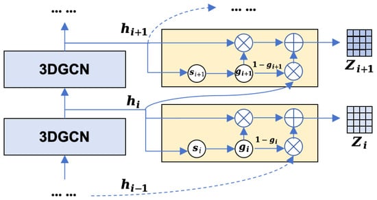 where denotes the time-aware adaptive receptive field gate for region at the l-th layer, represents the output of region from the l-th 3DGCN layer, and corresponds to the output of region from the layer.